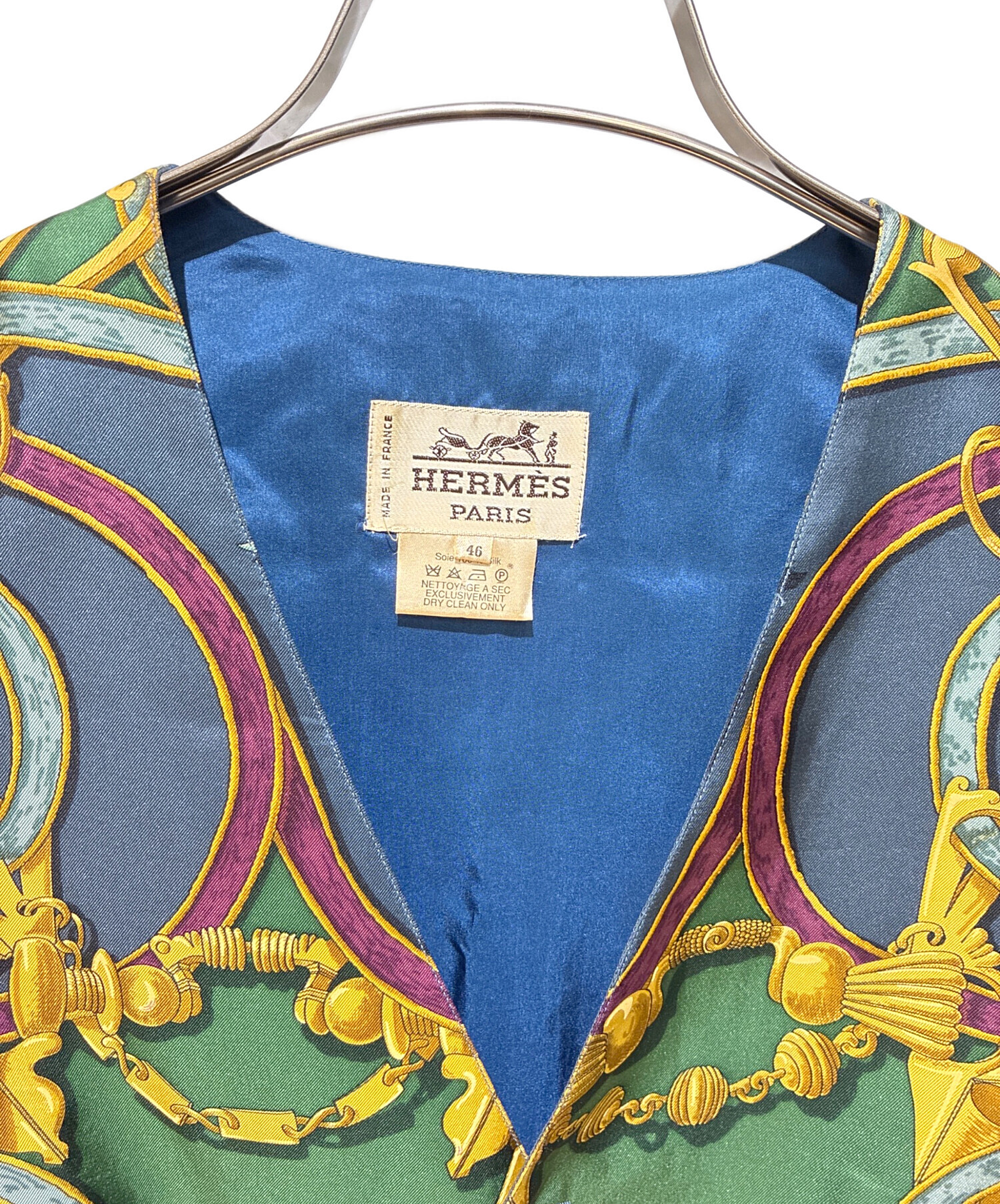 | スタッフコメント | スカーフ総柄のようなプリントデザインが特徴のベストです。シルク100%で、薄く高級感がございます。背面は紐を結ぶ仕様になっています。 |