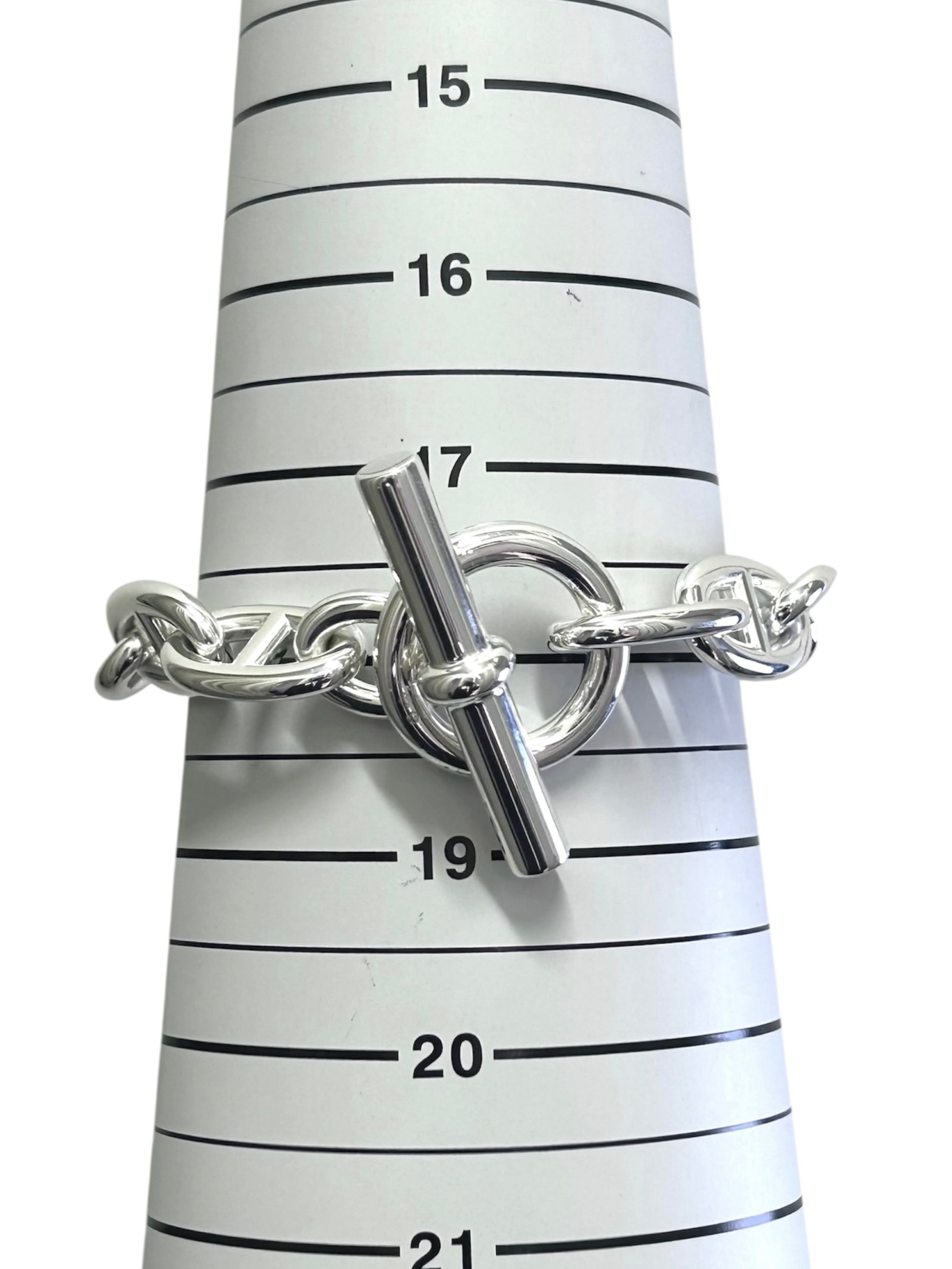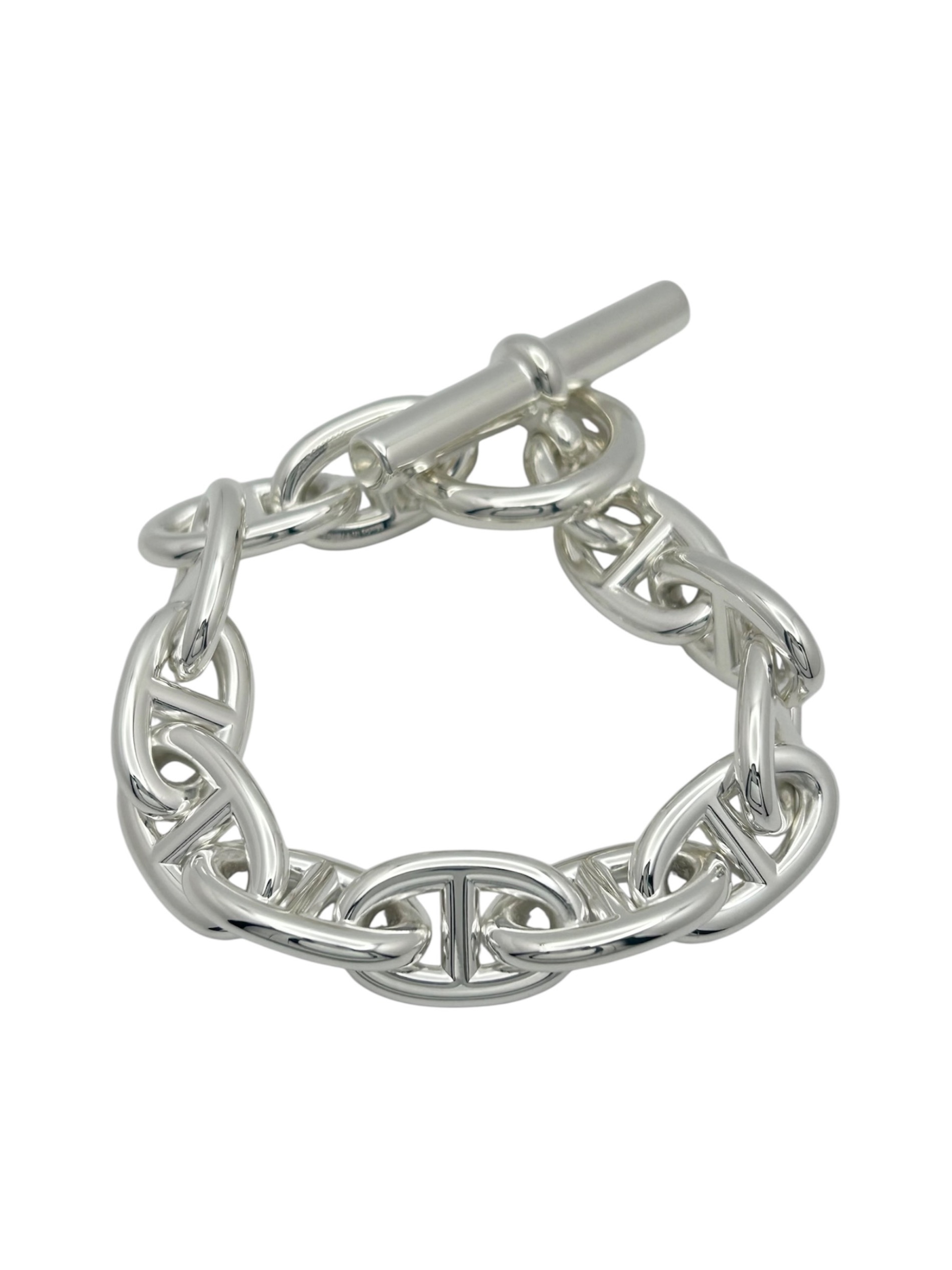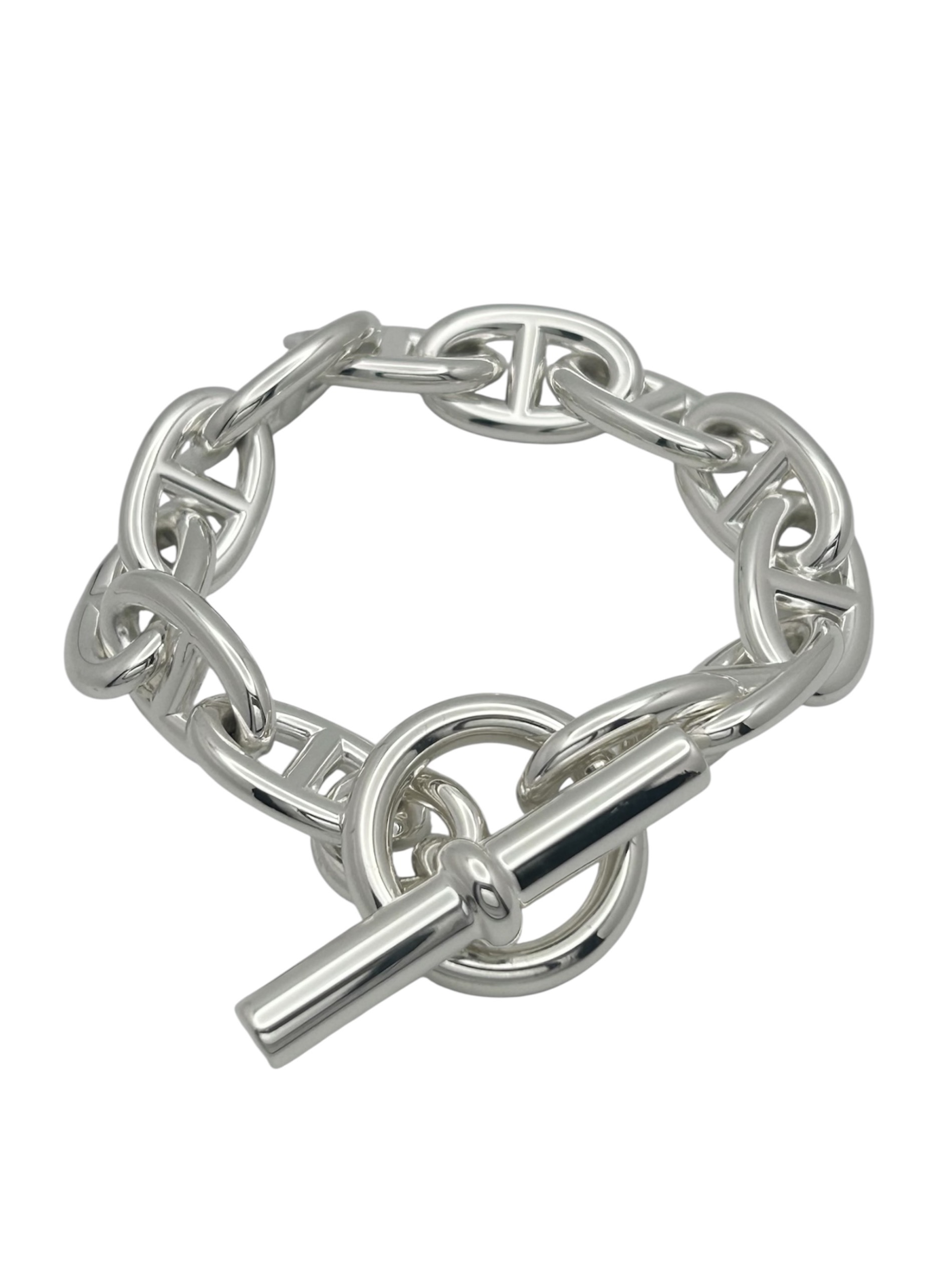 | スタッフコメント | HERMESのアイコニックアクセサリー「シェーヌダンクル」でございます。サイズはTGMとなっており、身に着けるだけで手元に存在感を出してくれるボリューム充分なブレスレットです。シルバー925素材を使用しているため、錆びにくく長くご愛用でき、また経年変化お楽しみいただけるアイテムとなっております。 |