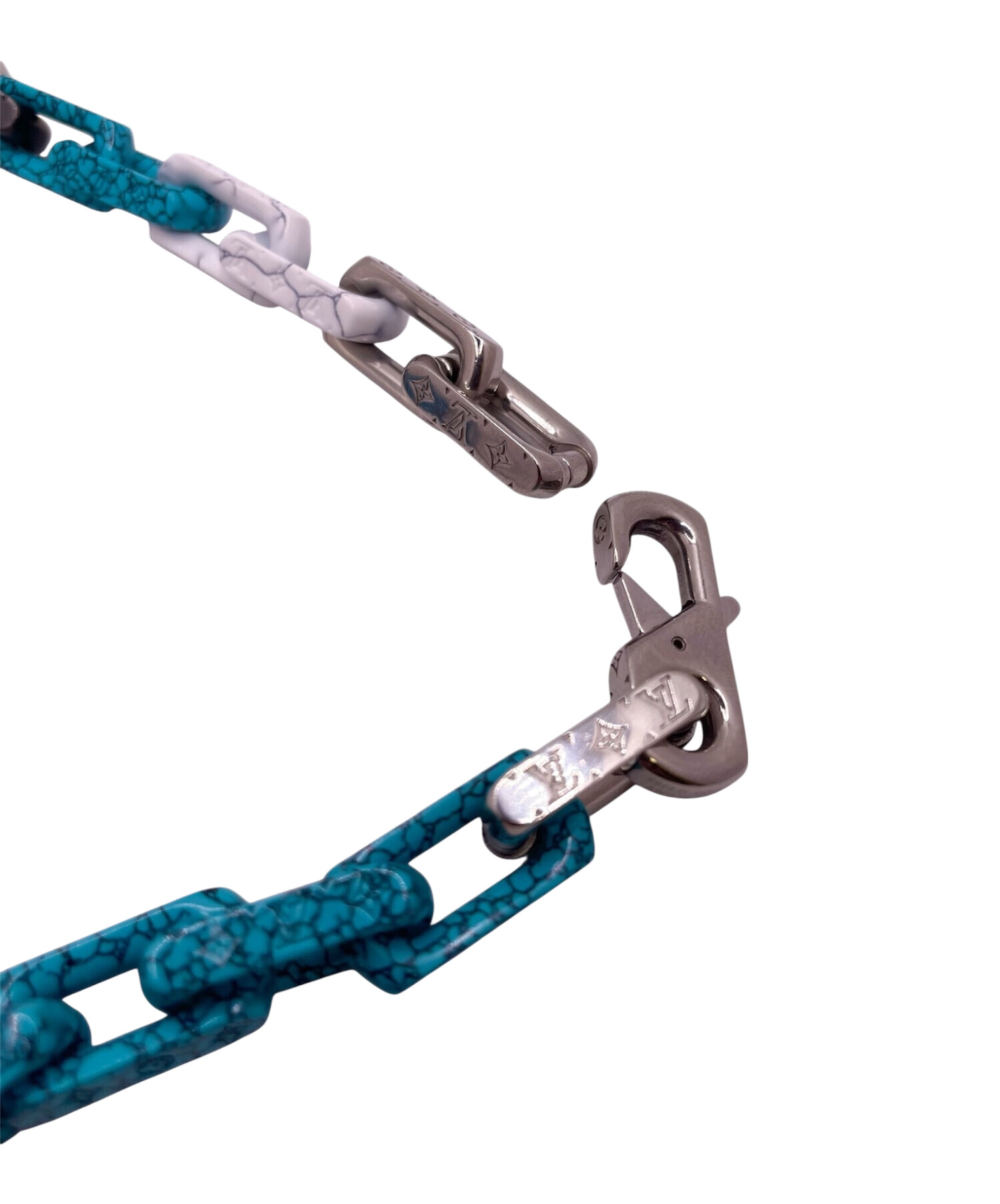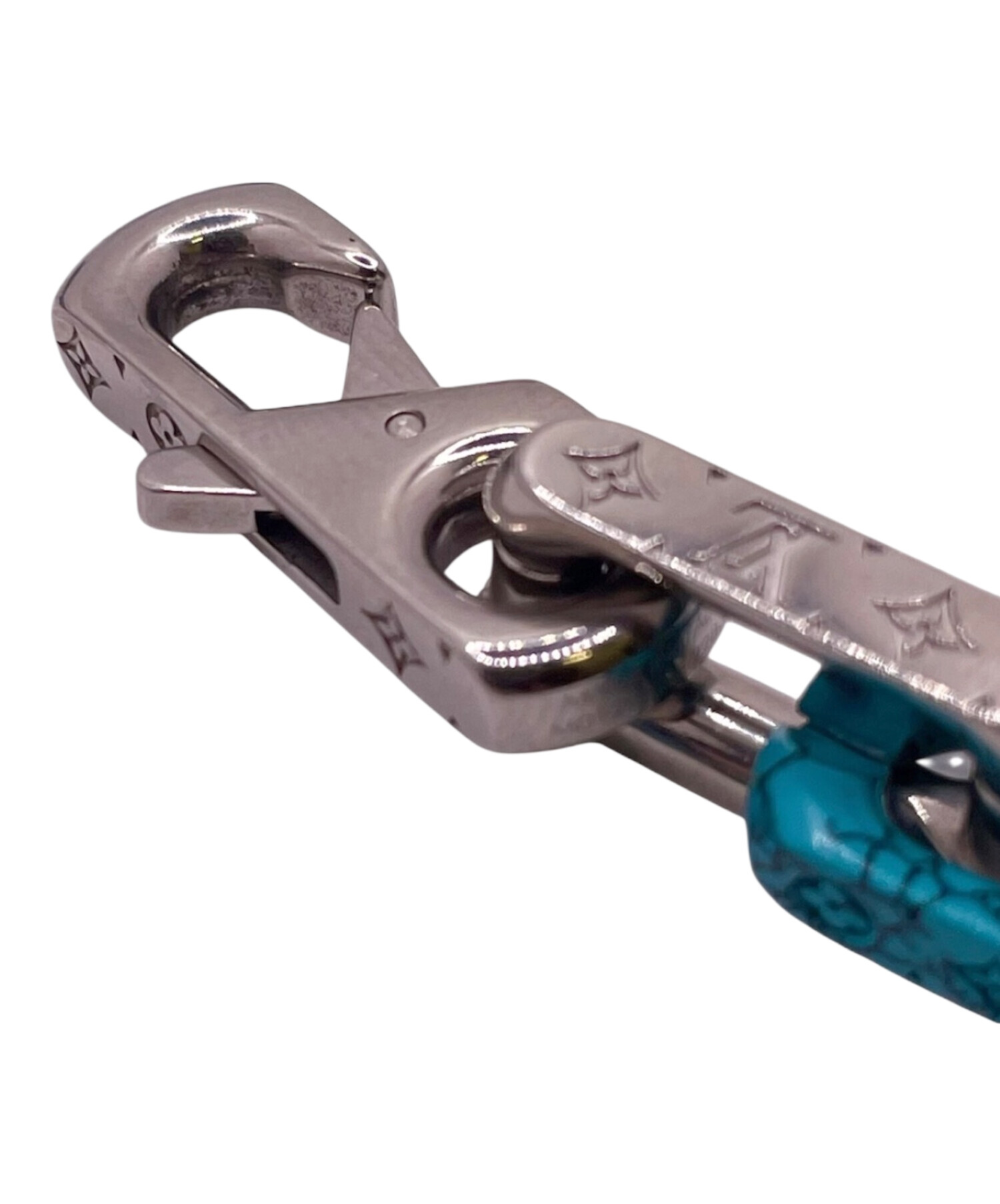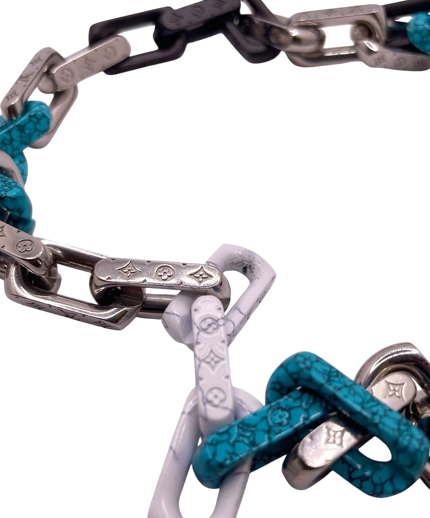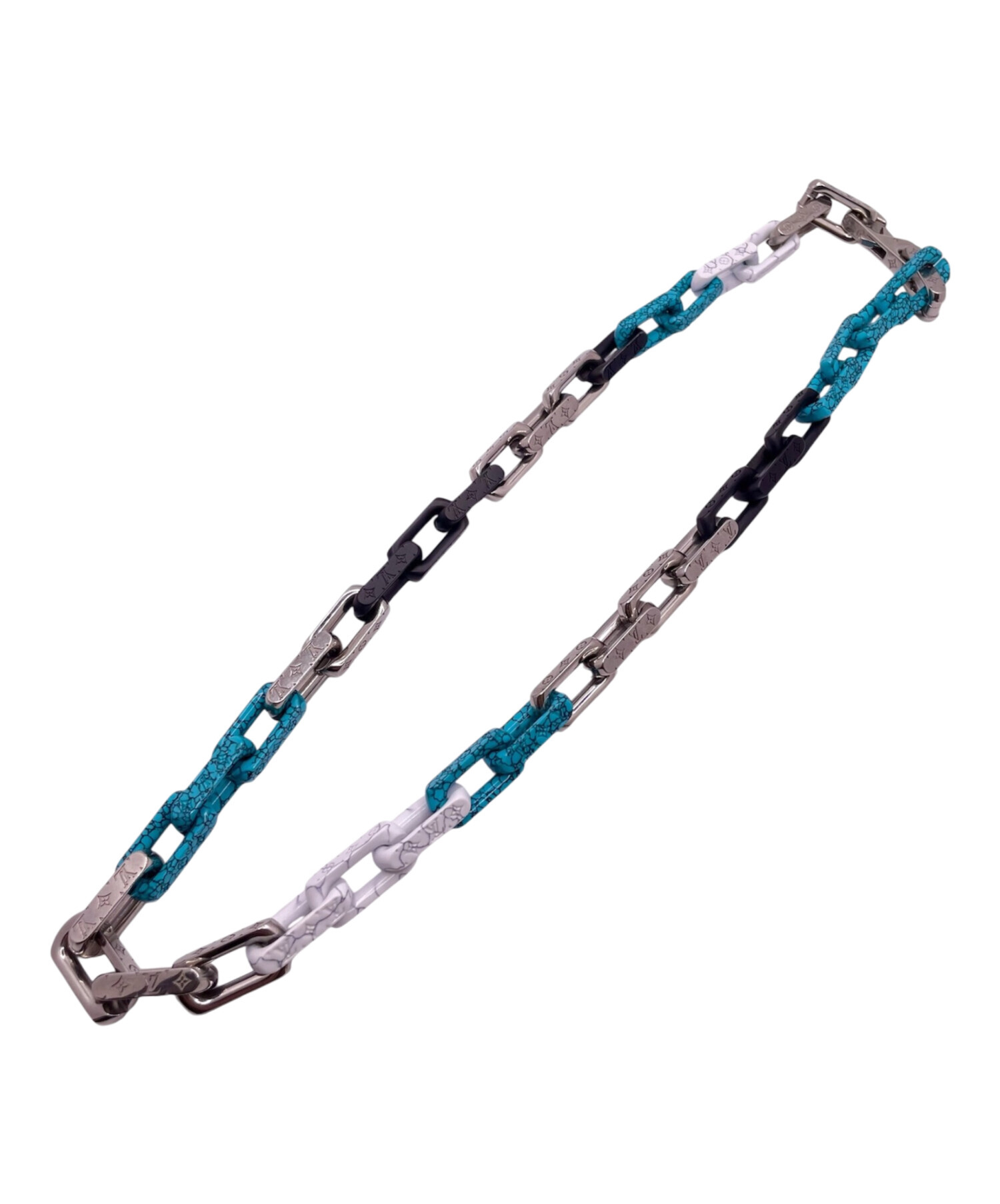 | スタッフコメント | シルバーに加えてマットブラックやブルー・ホワイトのストーン風の仕上げが施されたルイヴィトンのモノグラムチェーンストーンネックレスでございます。各リンクには、ブランドを象徴するモノグラム柄が施されいます。重厚感あるデザインで首元にインパクトを与えるおすすめのアイテムです。 |
