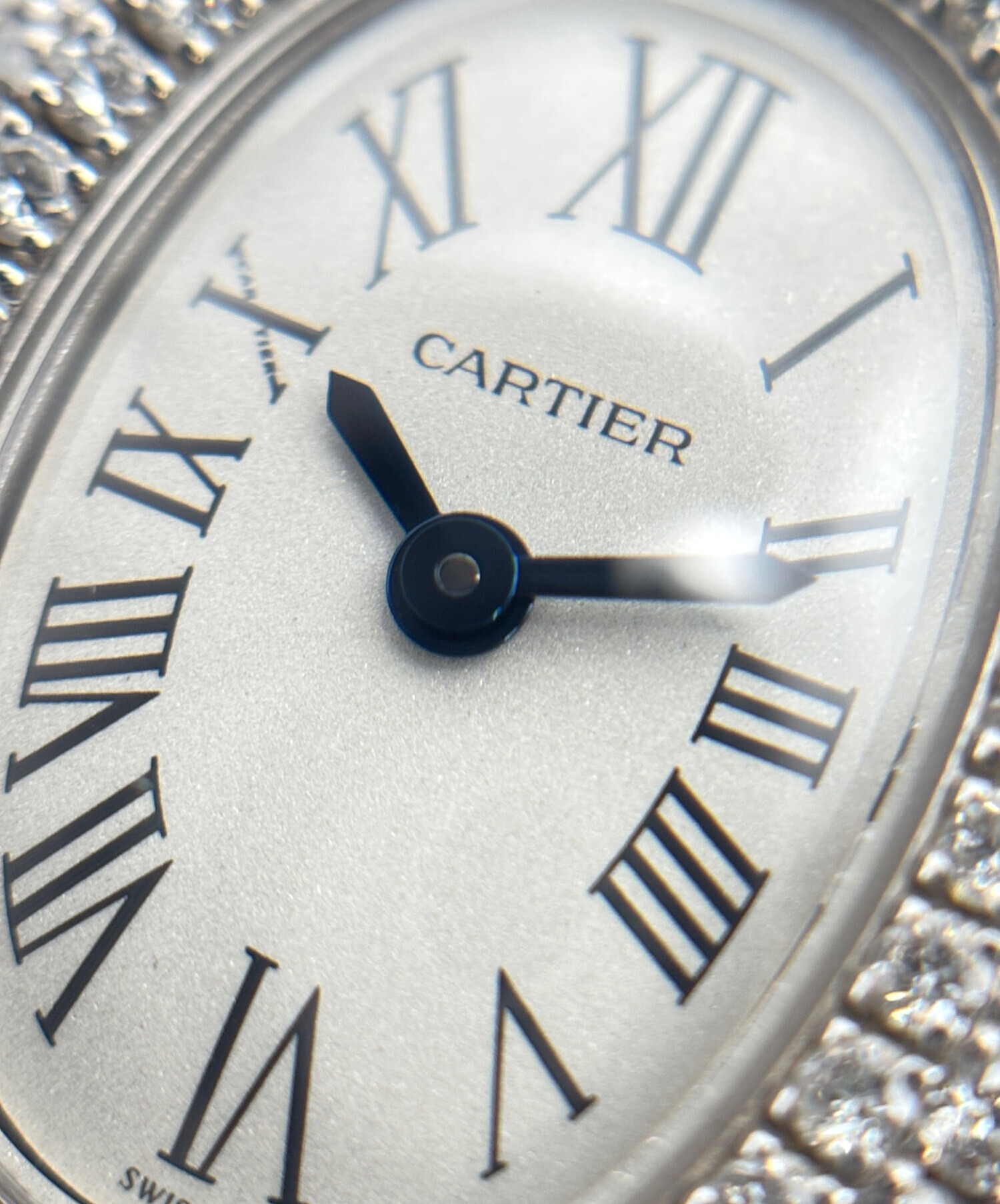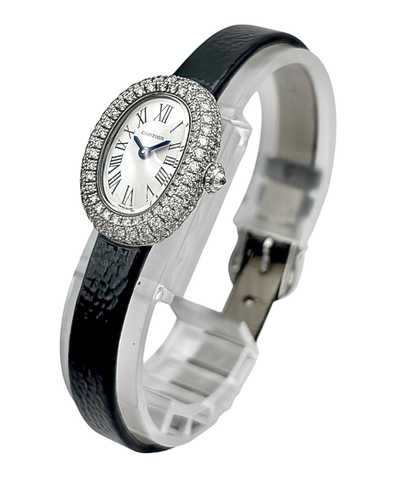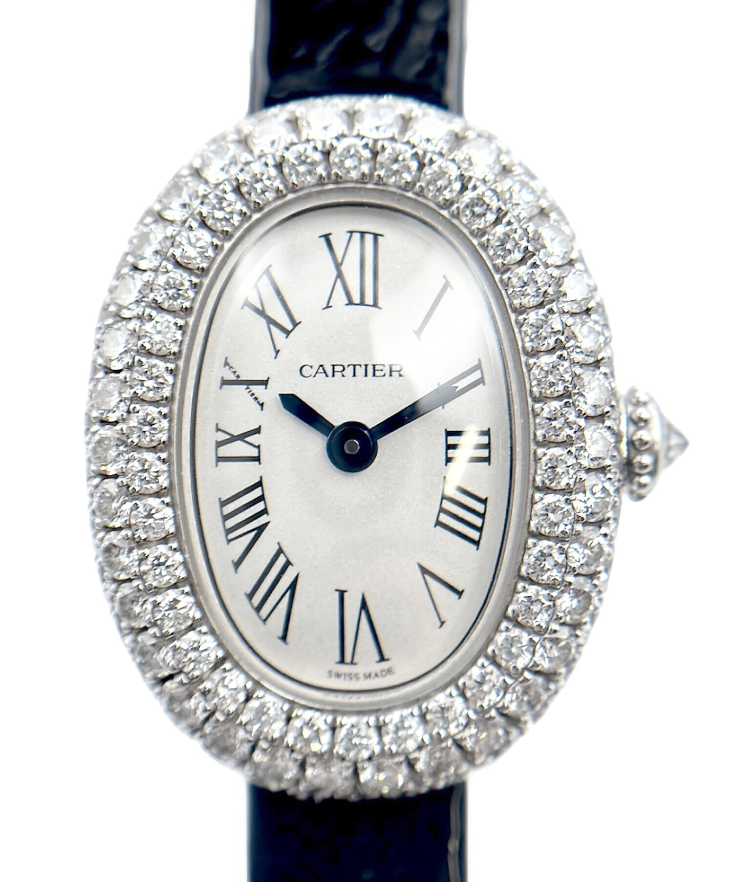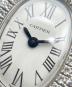 | スタッフコメント | Cartierの「ベニュワール ミニ」でございます。K18ホワイトゴールドにダイヤモンドをあしらい、華やかさと上品さを兼ね備えたアイテムです。楕円形のケースとローマンインデックスがクラシカルな雰囲気を漂わせ、ホワイト文字盤が洗練された印象を引き立てます。ブラックのレザーベルトが全体を引き締め、エレガントな装いを完成させます。 |