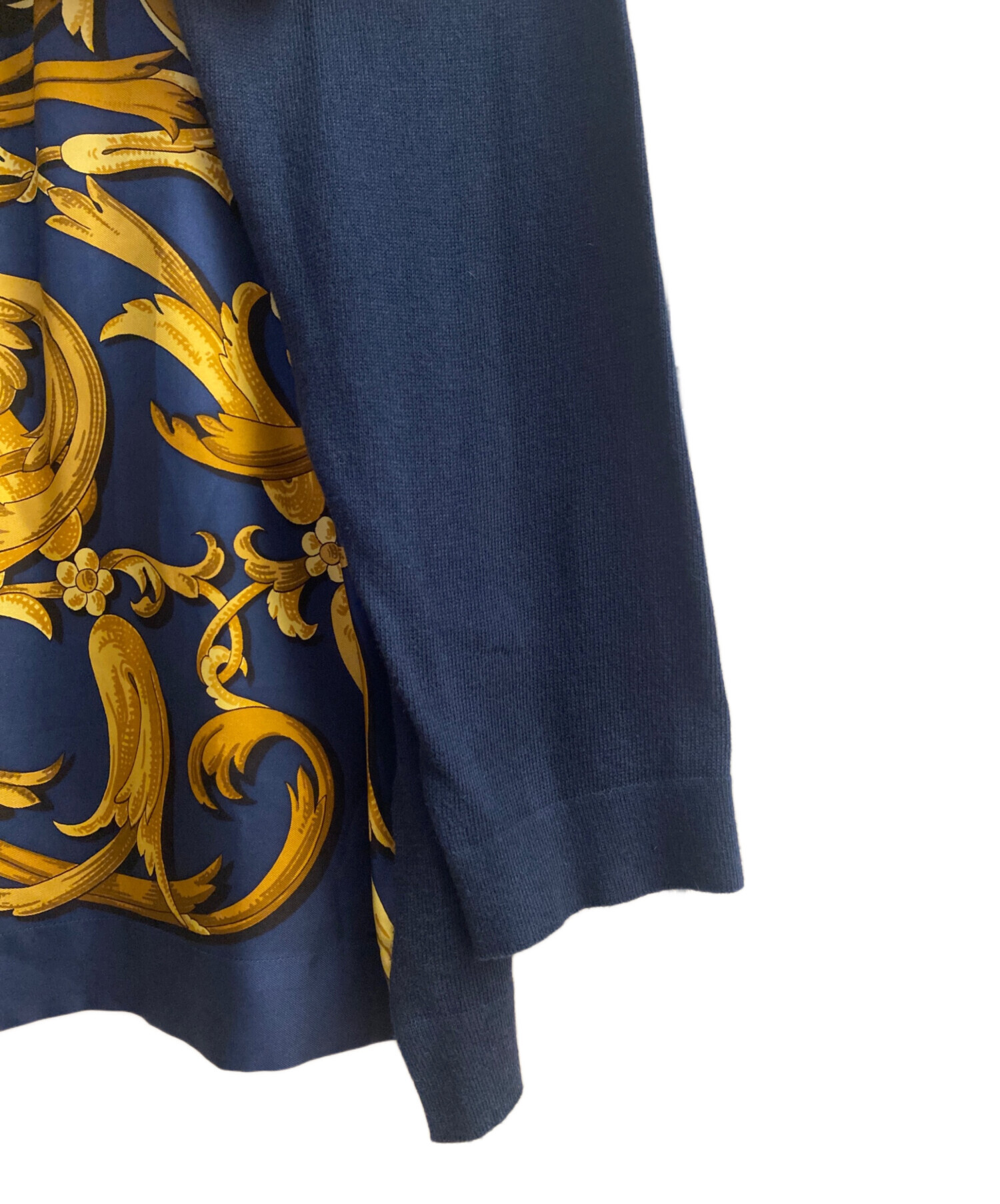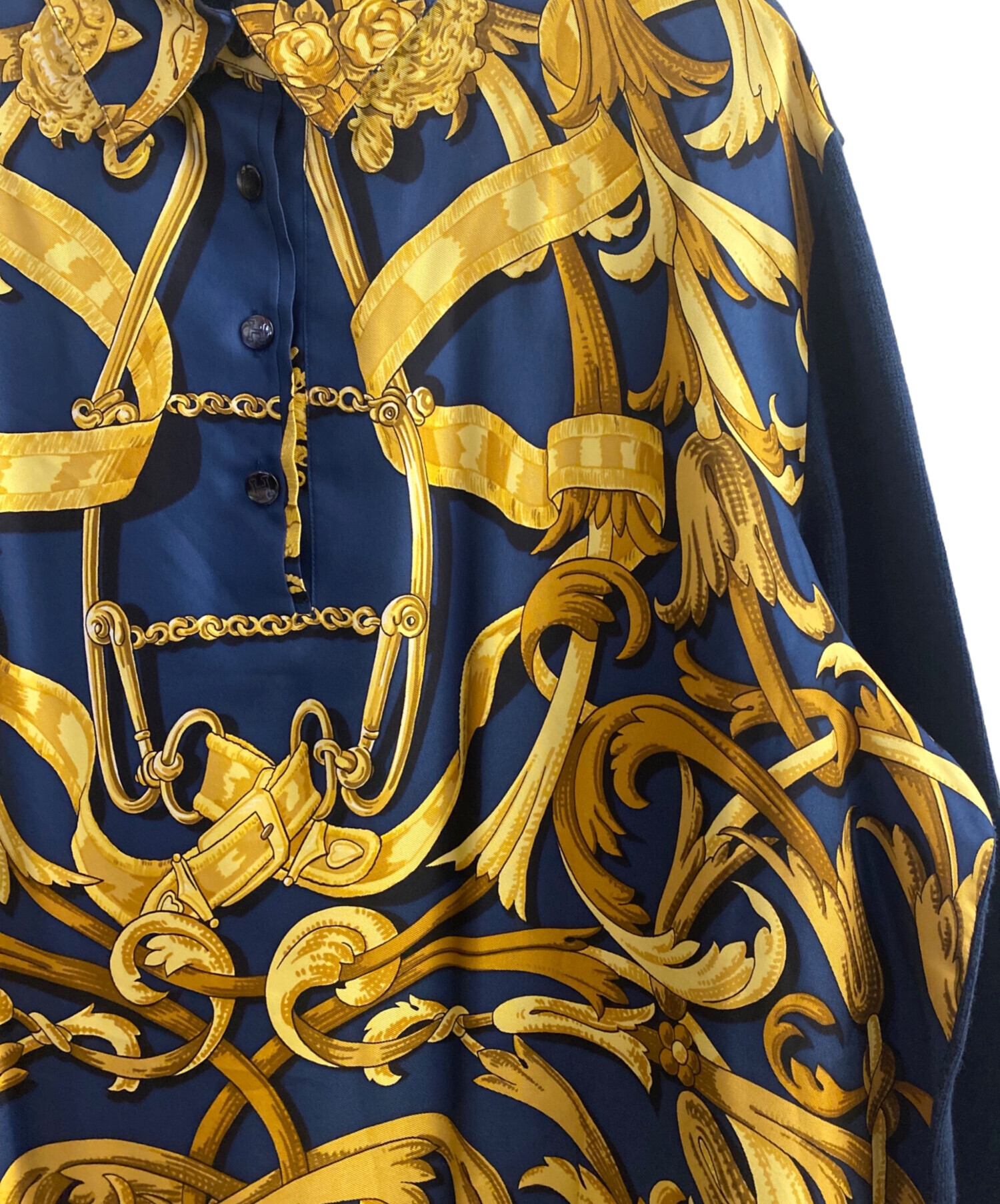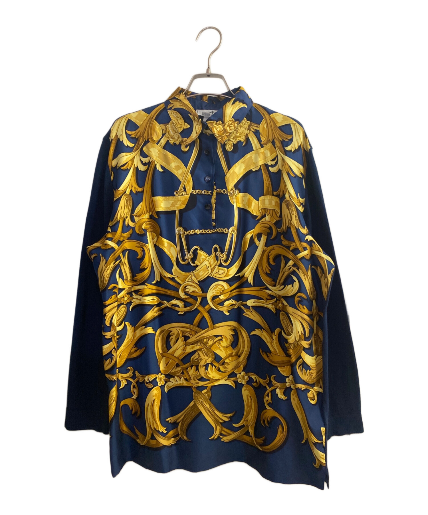 スタッフコメント HERMESの象徴的なスカーフ柄の切り替えデザインが特徴の長袖シャツでございます。シルクのなめらかな手触りと光沢感が上品な印象で、Hのロゴボタンがさりげないアクセントになっています。袖の切り替え部分にはカシミヤが使用されており、保温性や肌触りにも優れています。