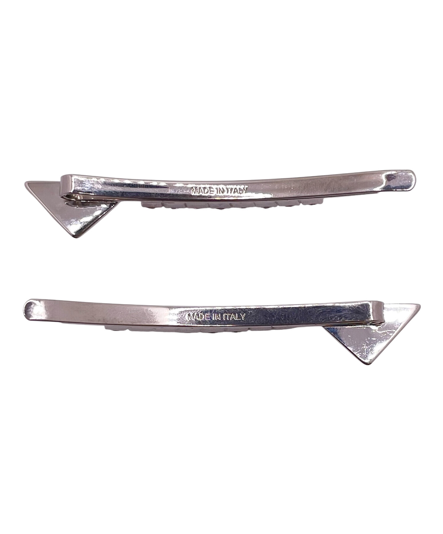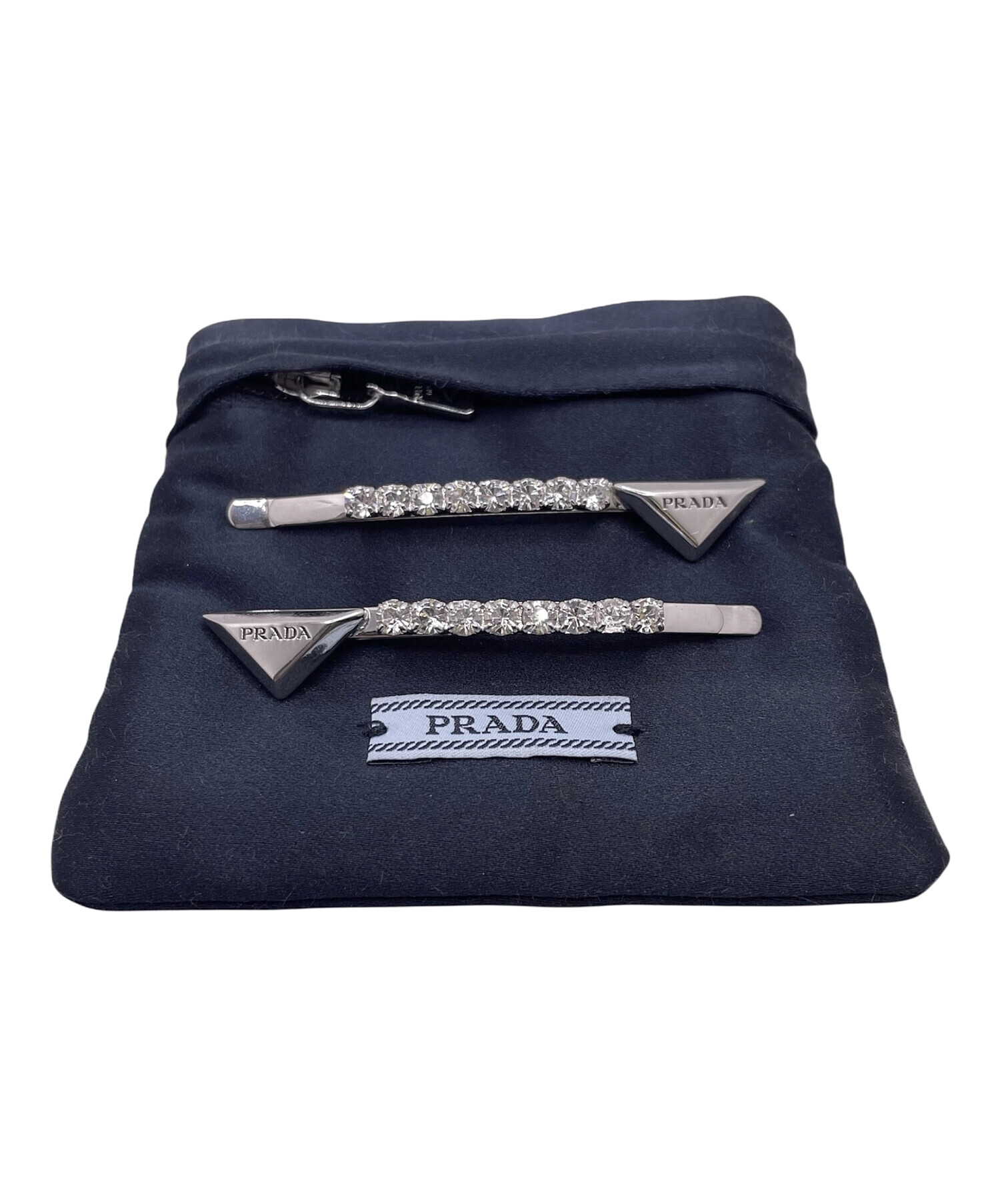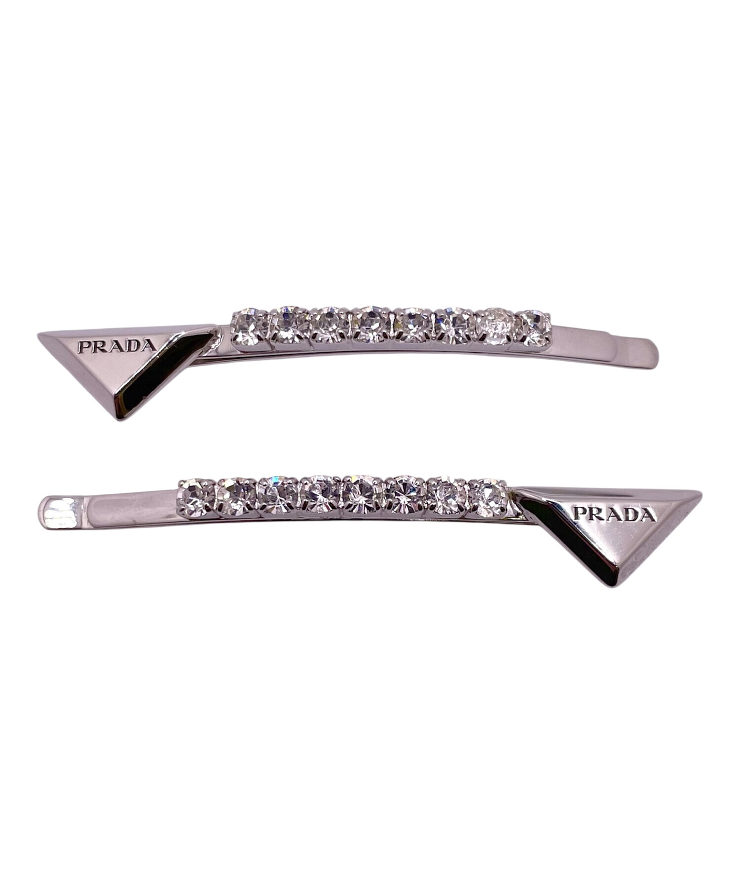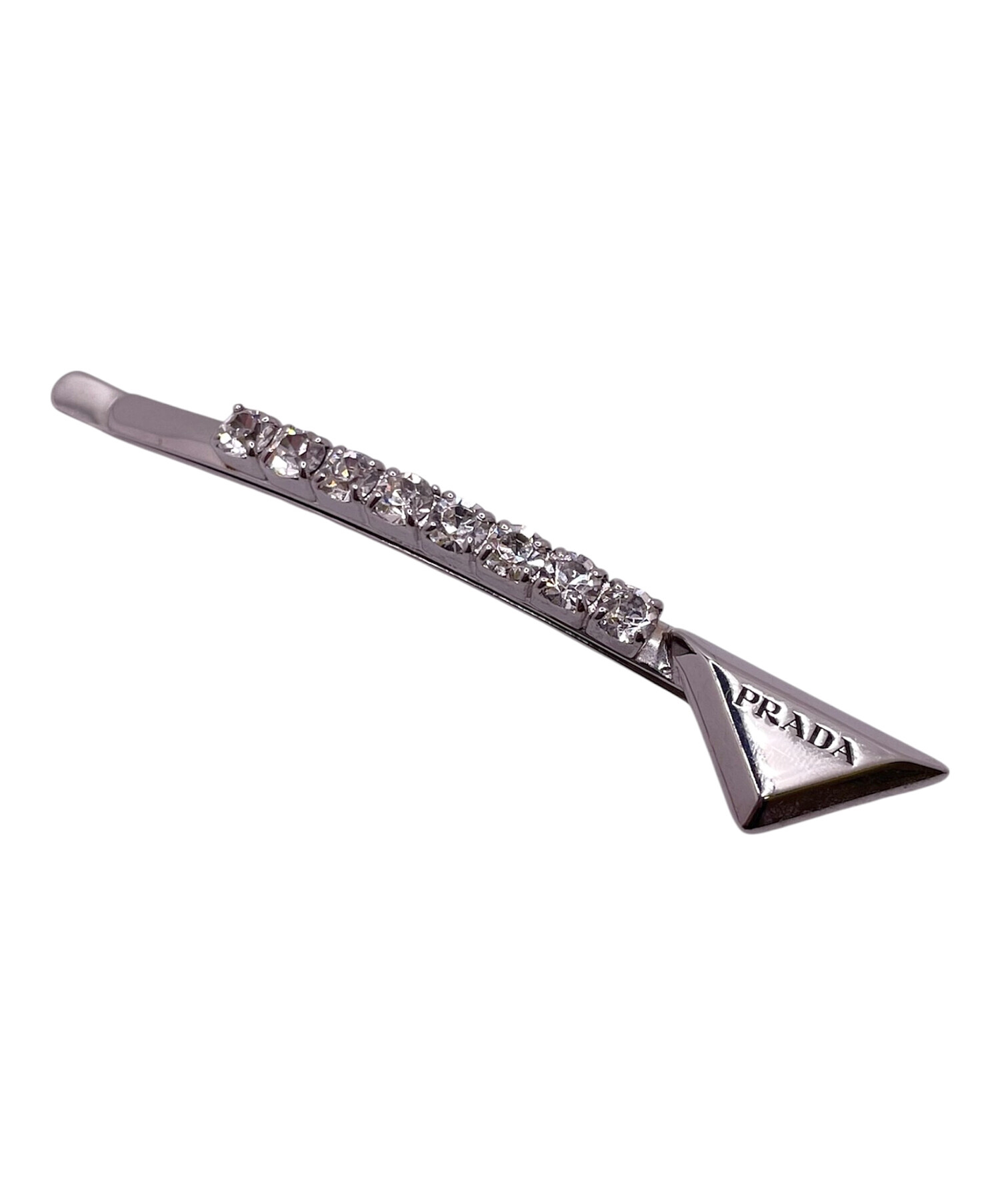 | スタッフコメント | プラダを象徴するトライアングルプレートにクリスタルビジューが合わせられたヘアクリップです。ヘアアレンジにビジューの輝きが加わり、華やかな雰囲気になります。重ね付けや単体使いなど様々なアレンジを楽しむことができます。 |