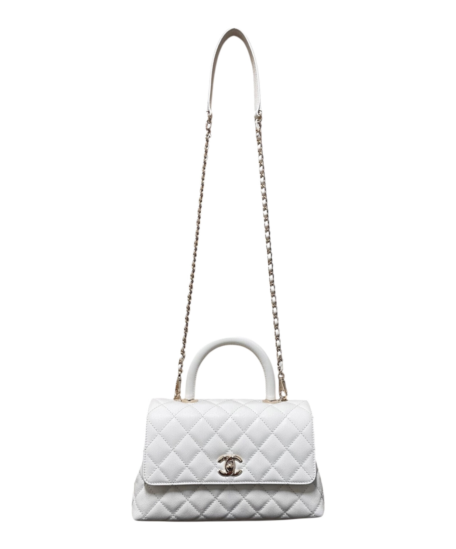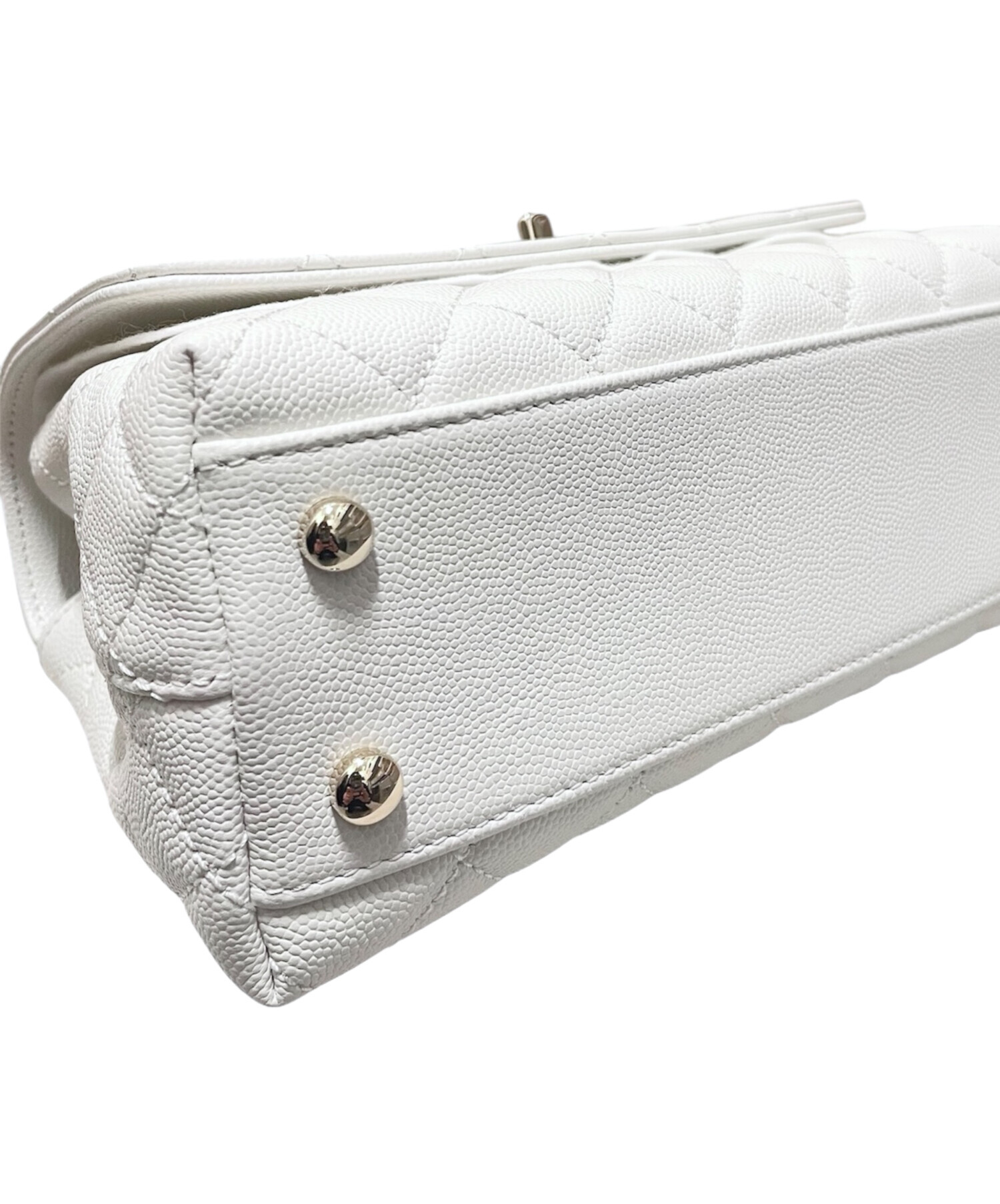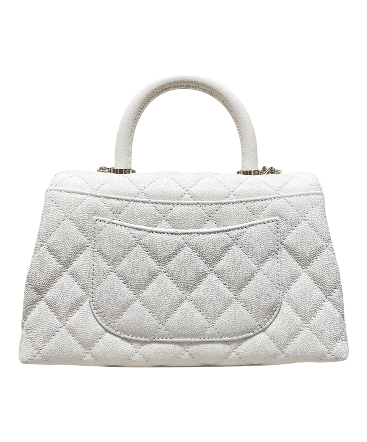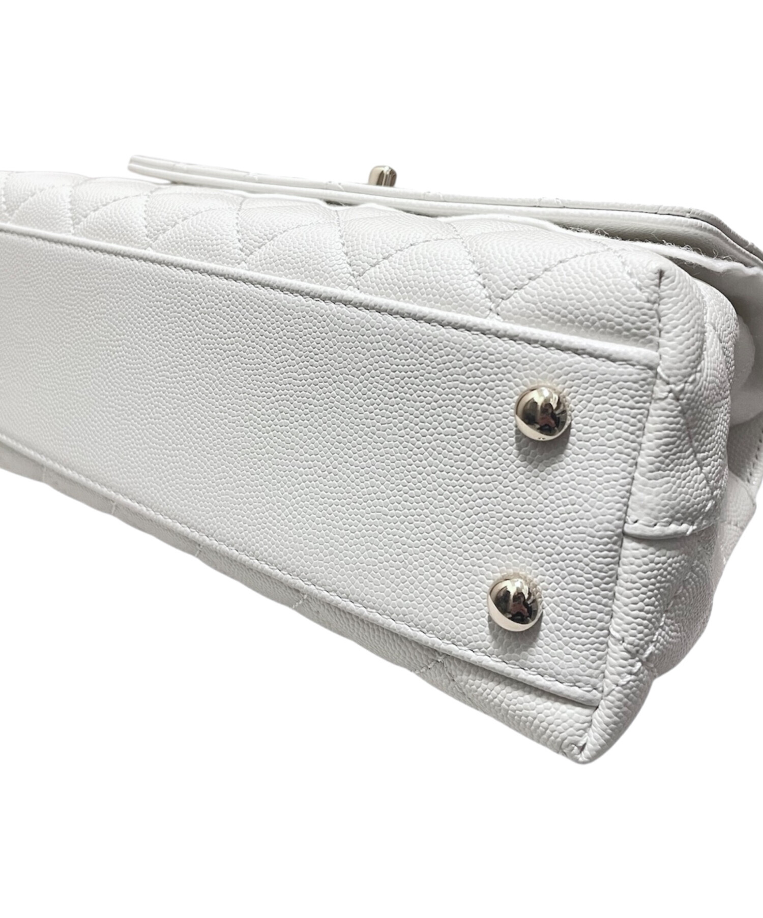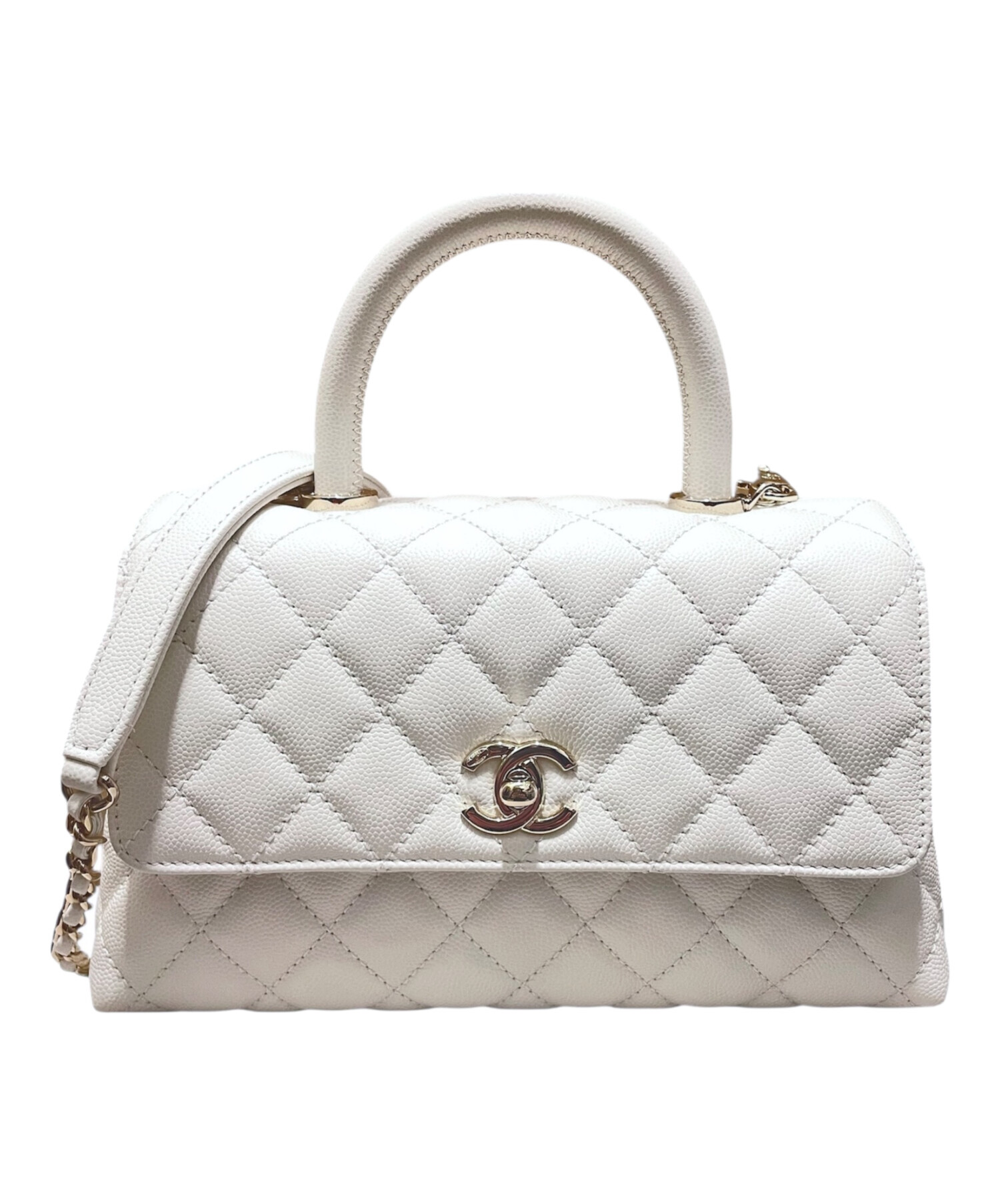 | スタッフコメント | 上品なホワイトカラーが印象的な、CHANEL「トップハンドル23」でございます。傷や汚れが目立ちにくいキャビアスキン素材で、日常使いにも安心してお持ちいただけます。ハンドルとストラップの2WAY仕様のため、シーンに合わせた使い分けが可能。コーディネートを明るく引き立ててくれる、実用性とエレガンスを兼ね備えた一品です。 |