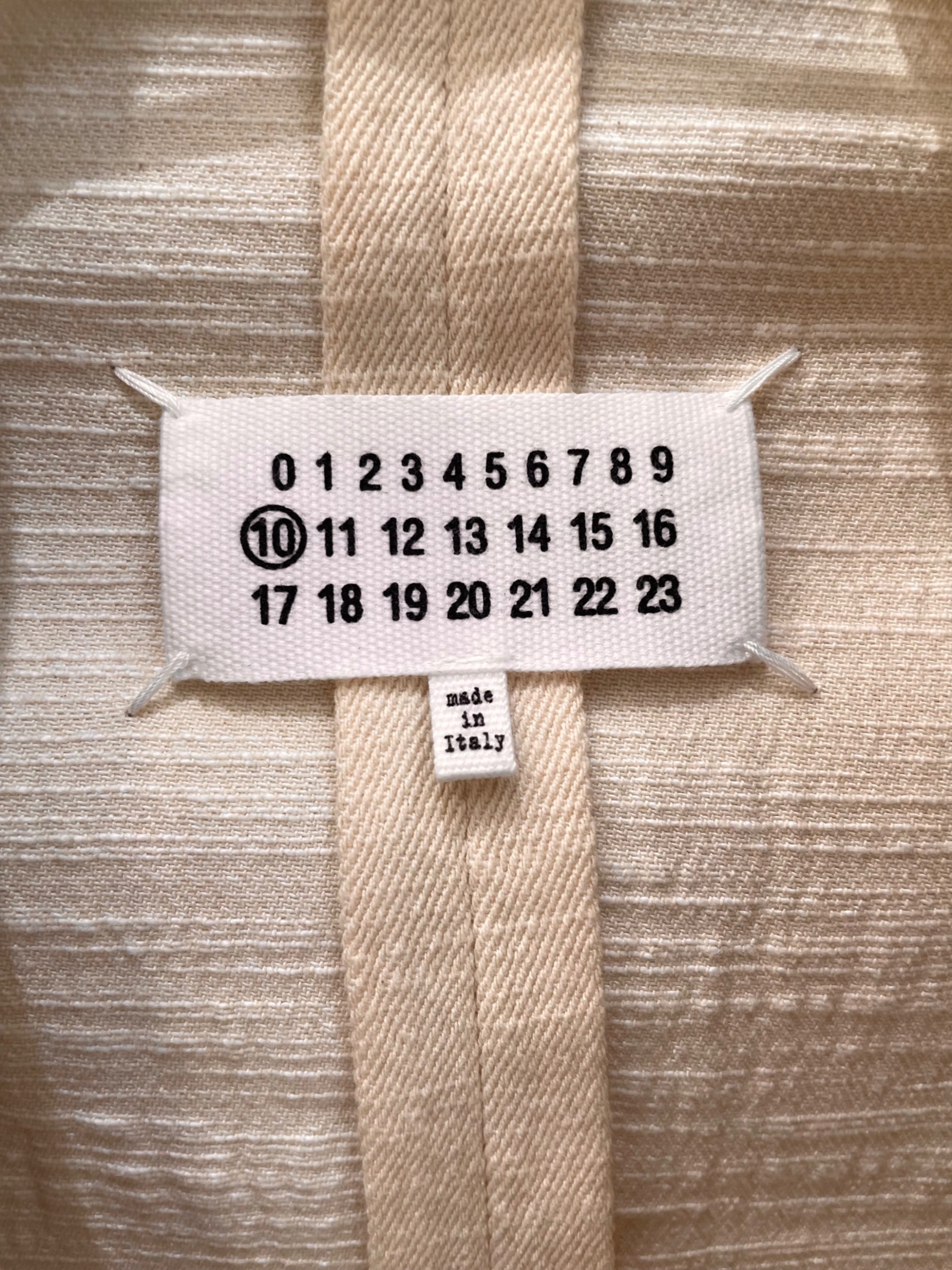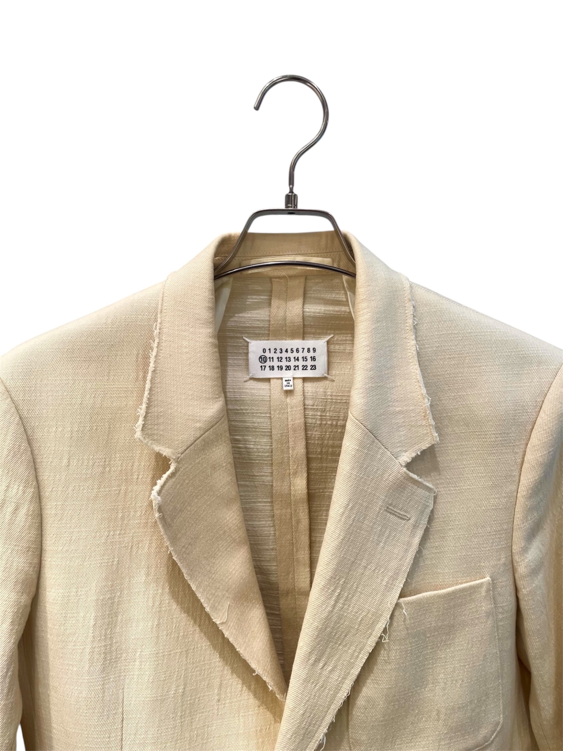 | スタッフコメント | メゾンマルジェラ(Maison Margiela)のカットオフジャケット。2Bテーラードをベースに、切りっぱなしデザインが特徴の10番ラインモデル。軽やかなクリームカラーと程よいサイズ感で、カジュアルからモードまで幅広いスタイリングに対応する一着です。 |