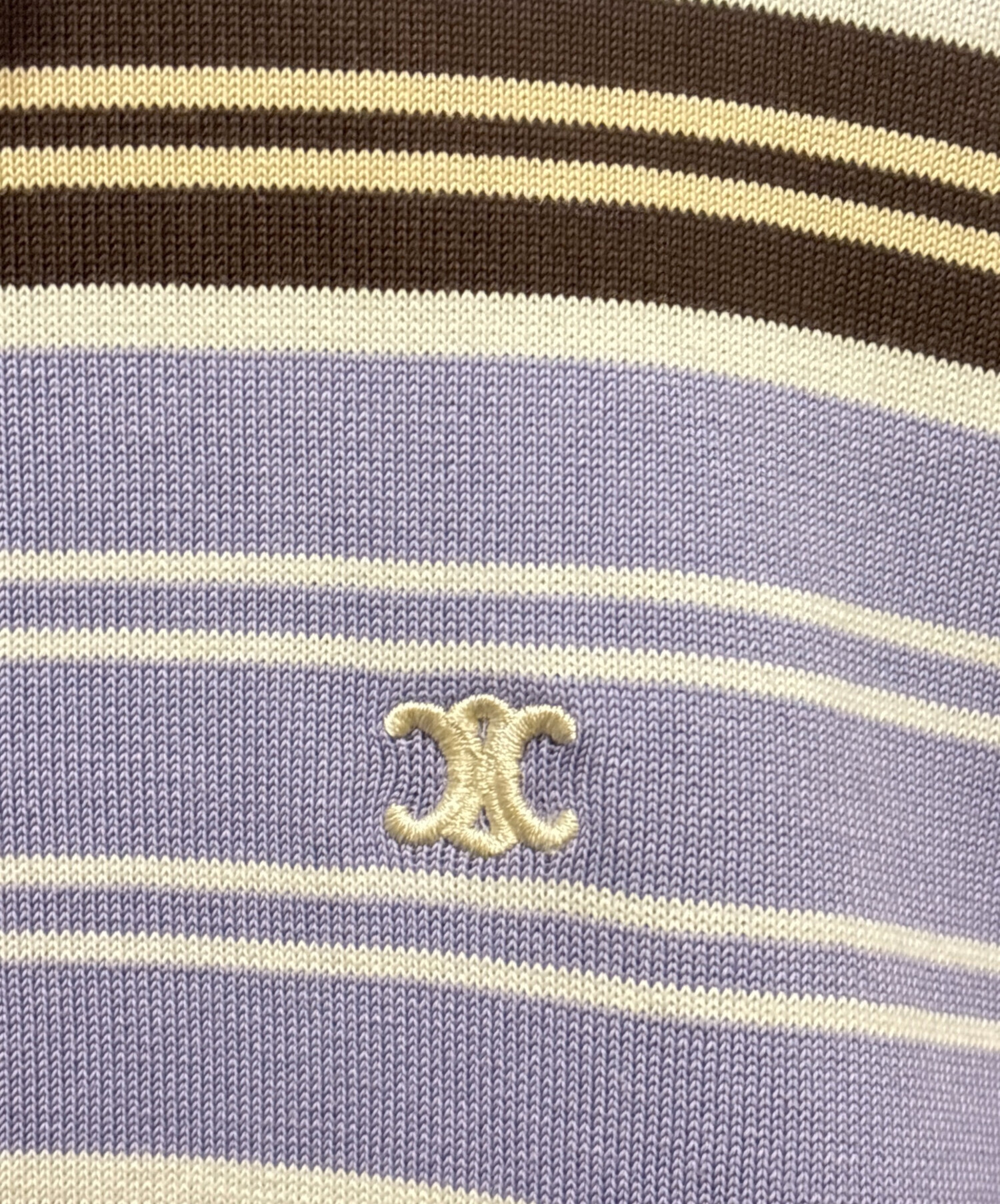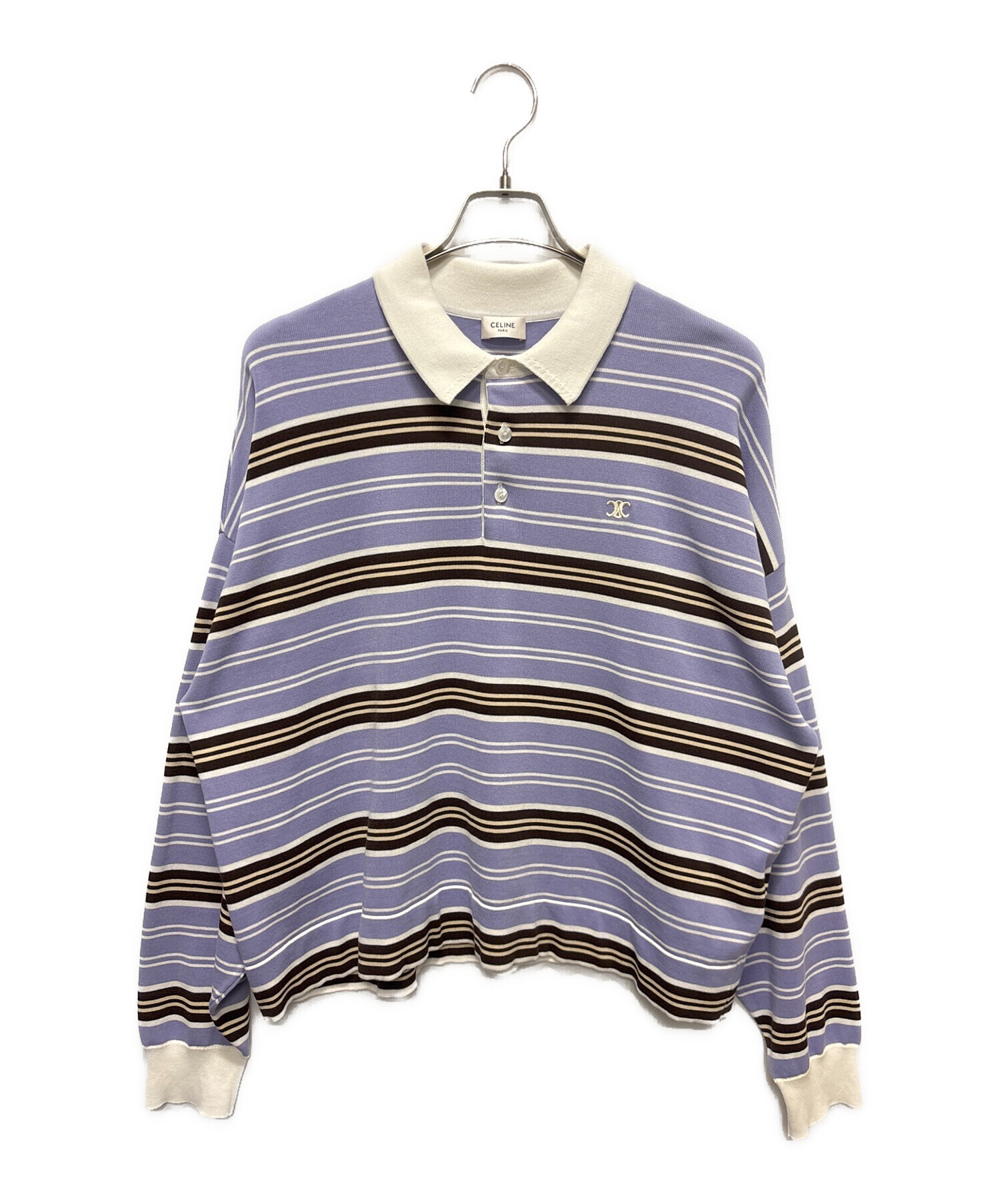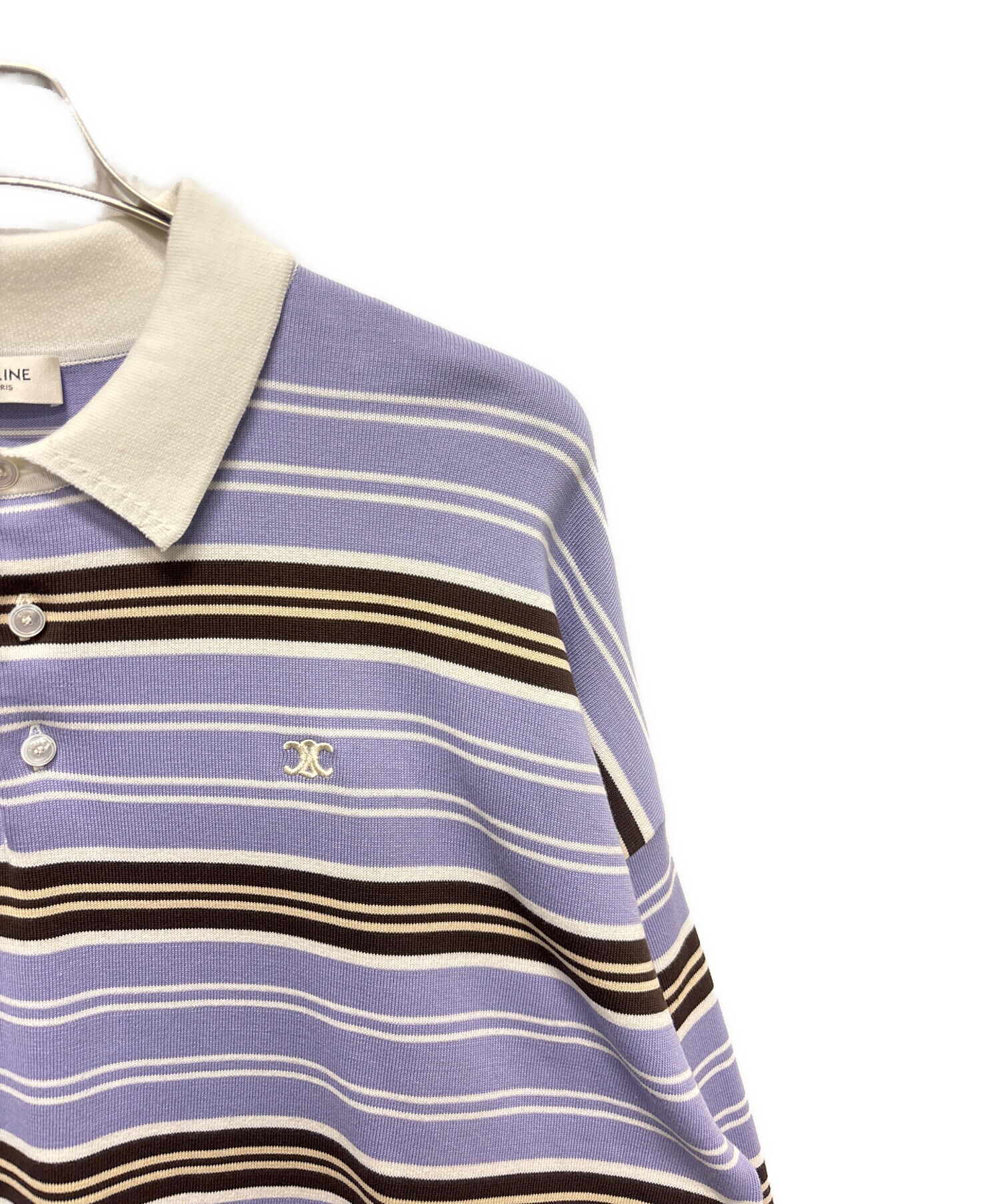 | スタッフコメント | CELINEのトリオンフボーダーニットポロは、パープルとブラウンの落ち着いた配色が上品な印象を与える一着です。クラシックなボーダー柄に胸元のトリオンフ刺繍が映え、ブランドらしいラグジュアリーなアクセントをプラスしています。スタイリングに取り入れやすく、カジュアルからきれいめまで幅広く活躍します。 |